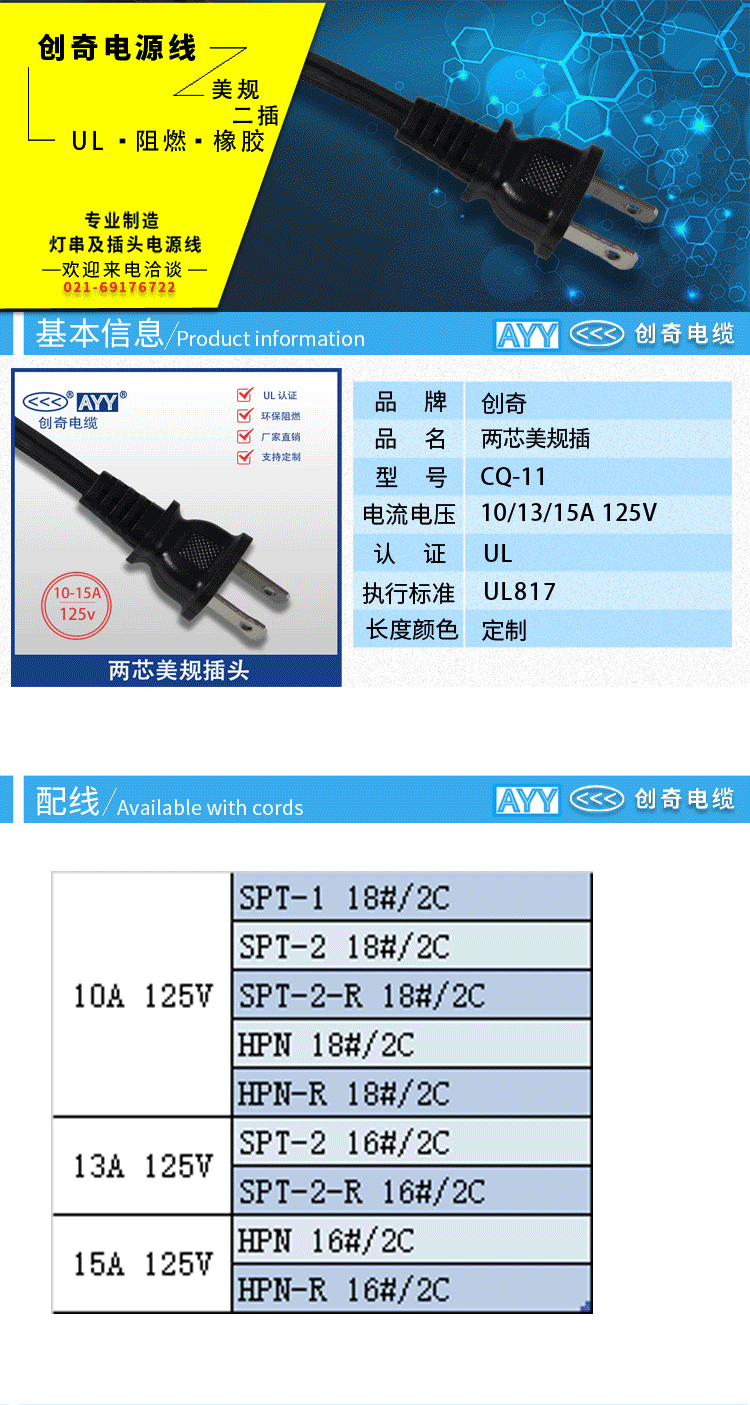 两芯美规插头